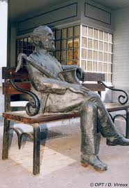 In het centrum van het stadje ontdekken we een enorme saxofoon! Nee, geen echte maar een standbeeld. Het beeld torent in de lucht op een sokkel. Ernaast staat een fontein die met geweld haar water omhoog blaast. Een eindje verder in de winkelstraat voor ons zit meneer Sax zelf op een bankje. Nee, alweer niet echt maar ook een beeld. Annet en ik poseren voor en onder de saxofoon en nemen plaats naast meneer Sax zelf. Ik probeer zelfs nog een deuntje te blazen op het instrument.