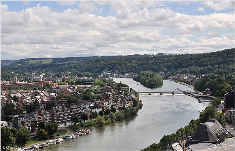 Boven ons staat fier en uitnodigend de Citadel ons op te wachten, naast ons kabbelt tevreden La Meuse. De zon straalt. De brug wappert met haar vele internationale vlaggen en de kerk beiert ons binnen.