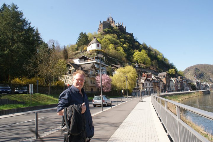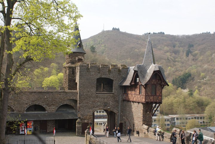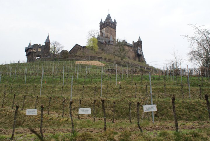 We beginnen de klim naar het kasteel. Een behoorlijke klim! De wijnranken staan alom om ons heen. Ik hoop dat het maar weer een goed wijnjaar mag worden! Het kasteel is prachtig maar zin om het van binnen te bekijken hebben we niet. Daar is het veel te mooi weer voor. Laat ons de natuur maar intrekken. Dus dalen we aan de andere kant van het kasteel de berg weer af langs poortwachtershuisjes en dichtbegroeide wanden. De Moezel na elke bocht weer in beeld.196567_214376731912846_6131873_n207943_214377205246132_2544060_n