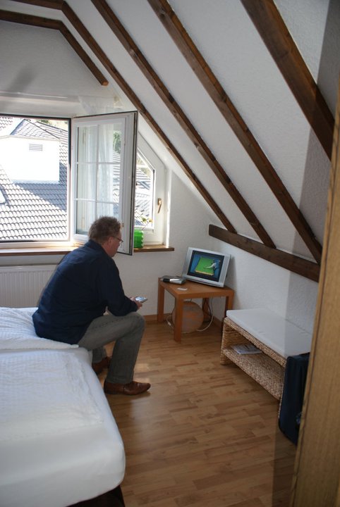 De volgende ochtend heerlijk Duits ontbijt met de in het centrum gekochte lekkernij. Het is echt ons zoldertje geworden! Het is dat de zon ons tegemoet straalt anders waren we zeker lekker op de zolder gebleven. Willem niet in het minst om Duits voetbal te kijken dat live wordt uitgezonden!205448_214376398579546_487736_n