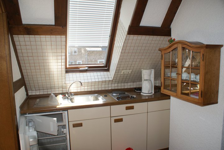 Ik heb een appartement gehuurd in een typisch Duits Moezels huis. Maar als ik aanbel doet er niemand open. Wel hangt er een briefje op de deur. Fur neue Gaste! We worden op het briefje welkom geheten en moeten het nummer bellen dat erop staat. Dat doe ik dan dus maar. Een zeer vriendelijke vrouw beantwoord mijn oproep. Ze vertelt welk kamernummer we hebben. De ruime zolder boven! En de sleutel……? die ligt onder de bloembak voor het huis. 199671_214376888579497_255130_n