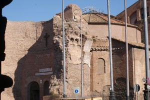 We slenteren tussen alle zuilen en restanten van bouwselen en wanen ons in een andere tijd. Tegenwoordig vind je er ook moderne kunstwerken tussendoor en soms vind ik dat best een beetje storend ook al vind ik de kunstwerken op zich wel mooi. Er zijn weer vele archeologische opgravingen gaande want de weg die ik een paar jaar geleden liep kan ik nu niet meer bewandelen omdat er allerlei hekwerken omheen staan. We lopen dus langs een zijingang het forum weer uit. Tijd voor een verfrissing en een toilet! Op Plaza Venezia vinden we een klein cafeetje in een smal steegje. De toiletten zijn schoon en dat is al heel wat voor Rome maar de espresso die Willem heeft besteld bestaat uit niet meer dan een bodempje. Willem kijkt wel drie keer in zijn kopje om zeker te zijn dat er wel wat inzit en kan niet geloven dat je hier vier euro voor betaald. Volgende keer maar cappuccino bestellen Willem! Al zittende en genietend van de drukte van Rome (verkeer en mensen) maken we ons volgende plan op! Als we nou het Piazza Venezia achter ons laten en de Via Plebiscilo inlopen die overgaat in de Vittorio Emanuelle, dan komen we vast via zijstraatjes bij het Pantheon en de Plaza Navona. De kop espresso, naja het bodempje dan, is snel op en dus sjokken we verder langs winkels en kerken. Ik heb Willem niets teveel verteld toen ik hem zei dat op elke hoek van de straat en ook vaak daartussen een kerk of basiliek staat. Hij verbaasd zich er net zo over als ik destijds. Ineens herken ik la Torre Argentina. De kuil die je op dat pleintje ziet is de kattenopvang van Rome. Als kinderen waren mijn zus en ik daar niet weg te slaan. In Rome lopen duizenden straatkatten rond, die zich graag verschuilen tussen de oude Romeinse monumenten. In het Largo di Torre Argentina is een speciaal opvangcentrum voor deze katten opgericht. Vrijwilligers van over de hele wereld komen hier meehelpen met de verzorging. Momenteel lopen er zo’n 300 thuisloze poezen rond. Ze zijn overal op en tussen de ruïnes te zien. Willem, die allergisch is voor katten heeft het er al gauw gezien en dus lopen we een steegje in welke ons naar het Pantheon zal leiden. En ja hoor….een paar leuke winkeltjes vol pauselijke kledij en wat antiekwaar verder komen we langszij het Pantheon en zien het vrolijke plein Piazza della Rotonda.