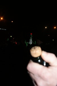 Iedereen is uitgelaten en opgetogen maar er valt geen verkeerd woord. We hebben geen ruzie, geen geudw en getrek of wat voor wanorde dan ook meegemaakt. We voelde ons veilig en opgenomen door de meute. Iedereen lacht, zingt en is blij. Dan begint het aftellen, dat wij niet geheel meekregen omdat we iets te ver van de Arc afstonden en de mensenmassa weinig geluid draagt, eerder dempt. Maar ineens hoorden we dan gejuich, geklap, geroep en een enorm knallen der kurken.