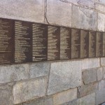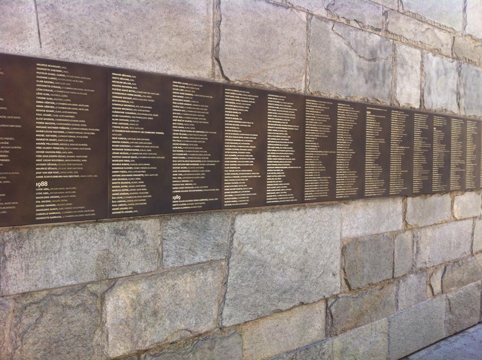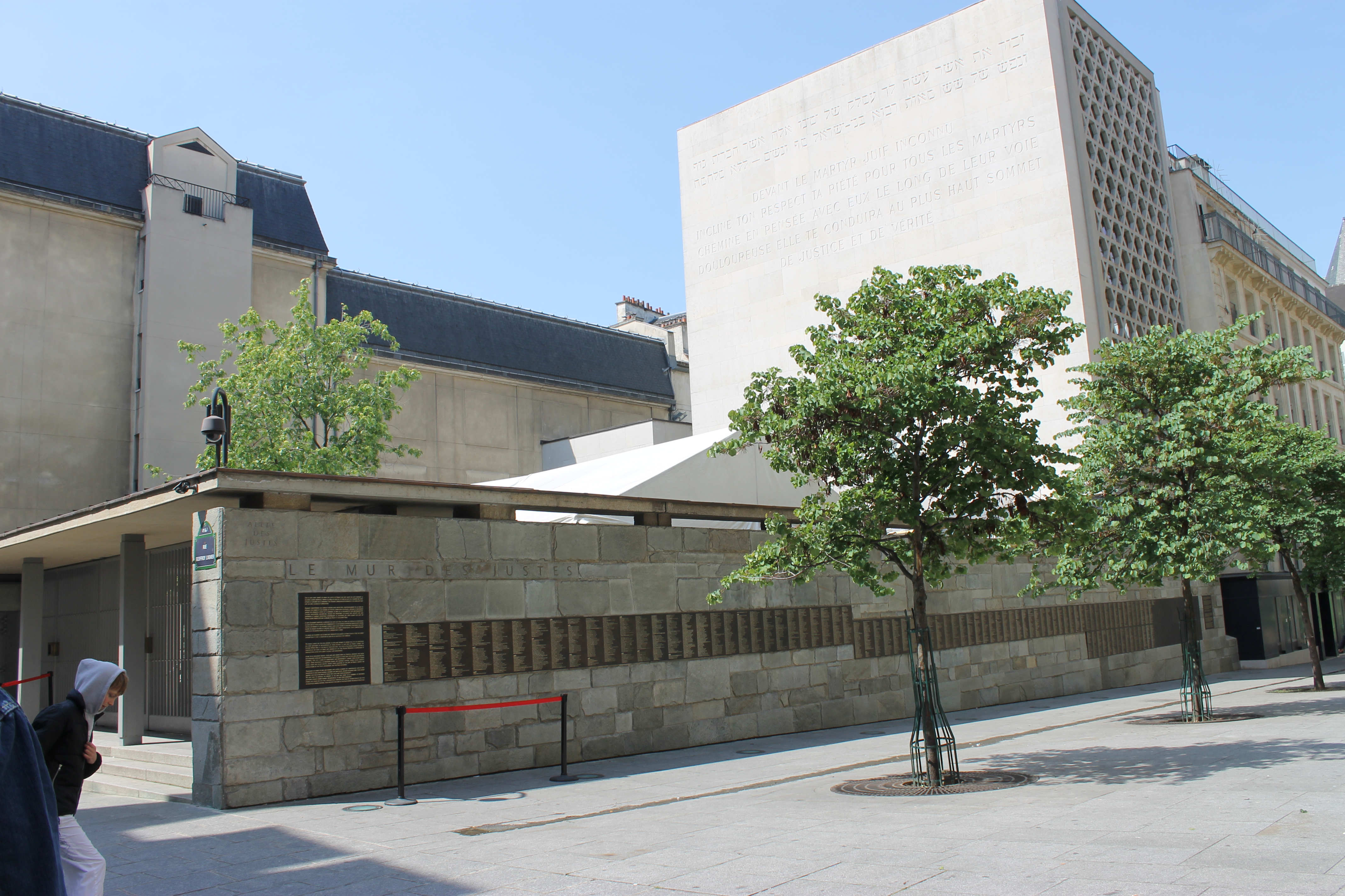 We slenteren, de weg gewezen door vriendelijke Parijzenaars, door naar museum Shoah. Een wit strak gebouw met een agent met karabijn ervoor. Het pad der rechtvaardigen bevindt zich buiten het museum, althans het is de buitenmuur. Je moet door een ijzeren hek, dan door nog een ijzeren hek/poort en dan ben je binnen. Je ziet het gedenkteken voor kinderen en de muur met namen….zoooooveel namen…. Hierna ga je het museum binnen.